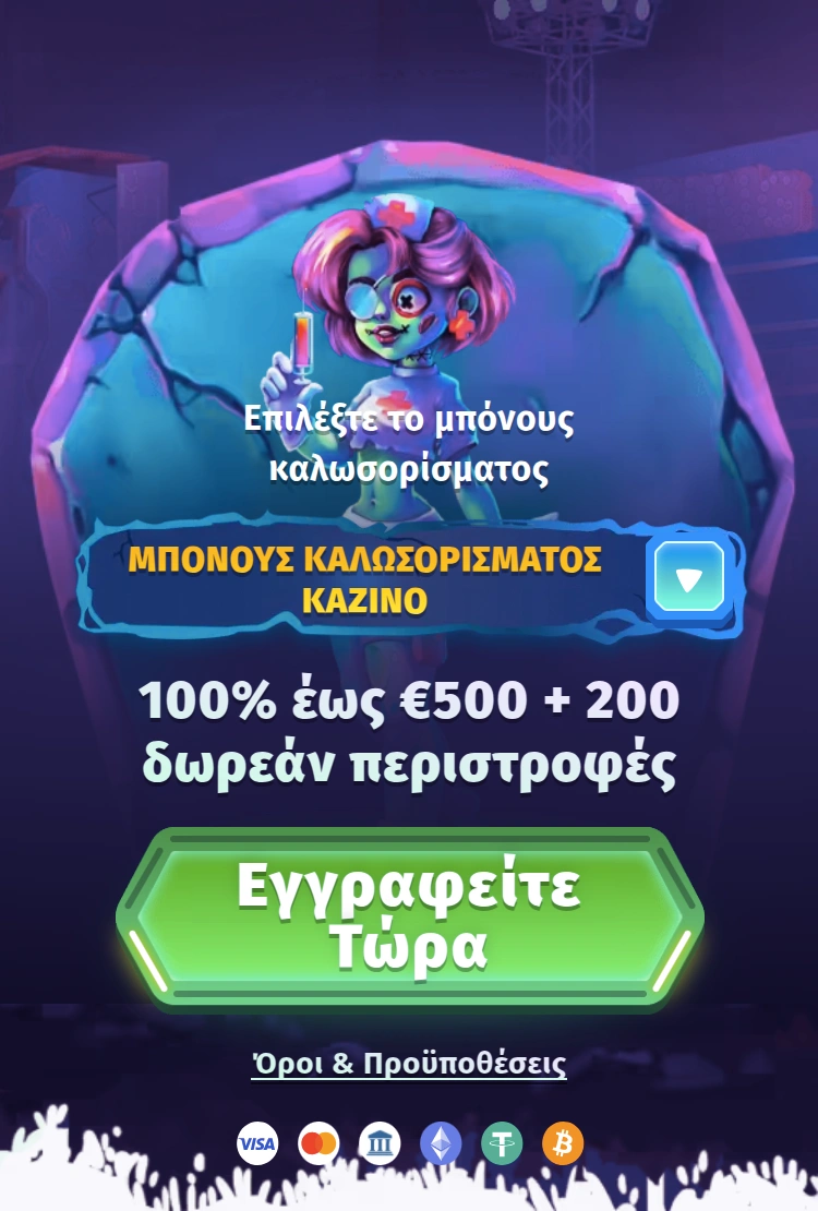 | Welcome Bonus 100% έως €500 + 200 FS | Κατάθεσε τουλάχιστον €20 και λάβε 100% μπόνους έως €500 + 200 δωρεάν περιστροφές. | (Κατάθεση + μπόνους) x35· κέρδη από FS x40 εντός 10 ημερών. |